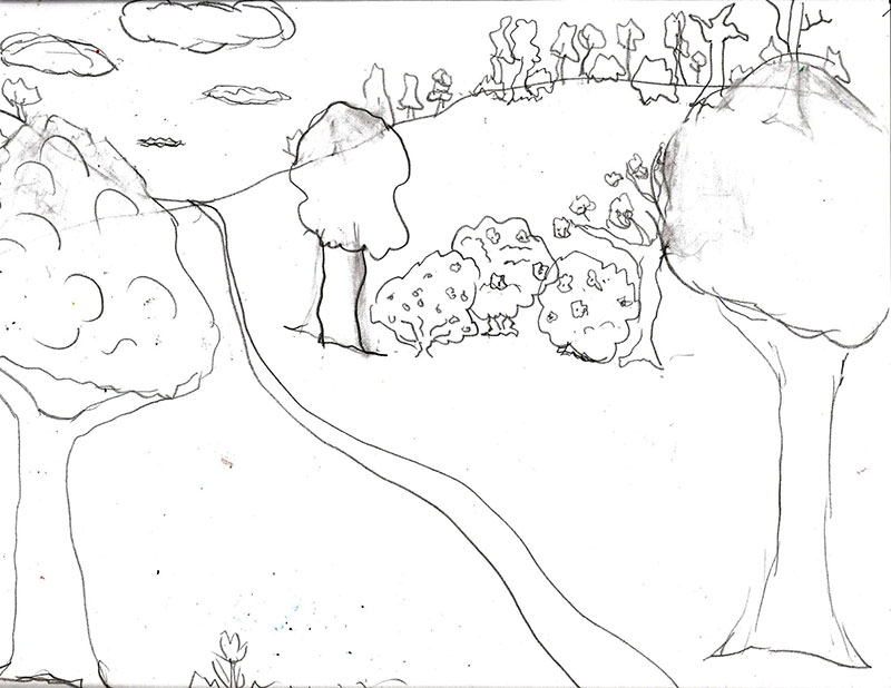 Lastly draw close up objects near the bottom of the paper and larger than the near objects, overlapping and erasing when needed. These are painted even brighter and warmer with more paint than water.