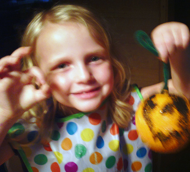 When thoroughly dry, we fold the green chenille stems in half and twisted them to look like the stems on the pumpkin and inserted the stems into our jack o’lanterns.