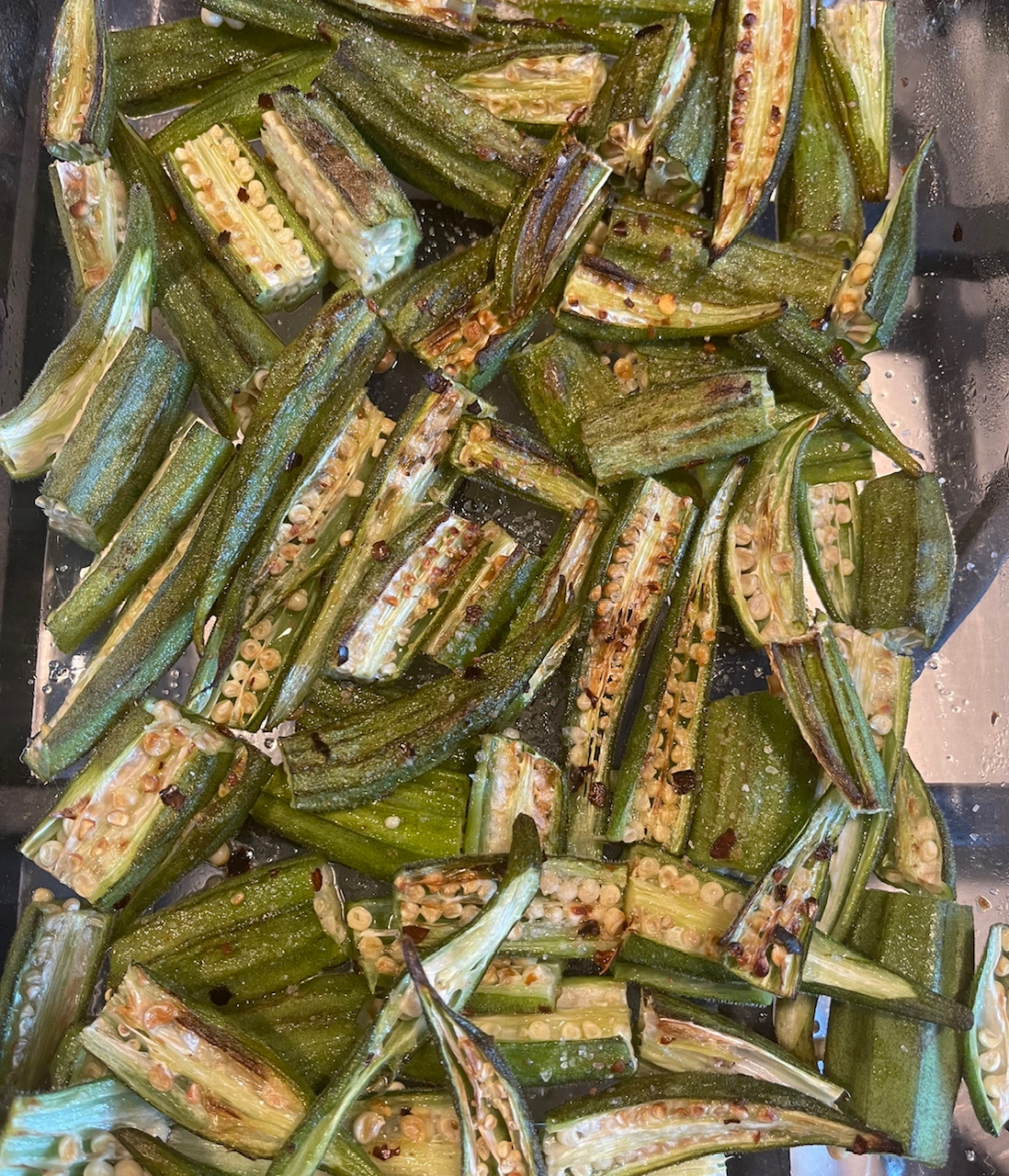 Slice your okra longways- or “hot dog style”- lightly cover glass pan with olive oil. Lightly cover okra with olive oil. Use those red pepper flakes you likely rarely use in your cabinet. Sprinkle to your preferred taste.